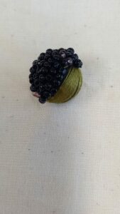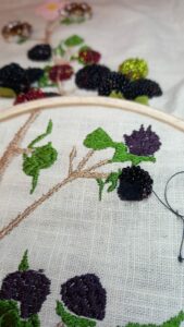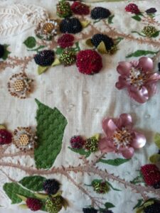 The blackberries themselves were created using wooden beads, wrapped in embroidery silk to create a smooth base. I then hand-stitched glass seed beads in shades of red, green and black onto the beads to create the appearance of plump, three-dimensional berries, similar to the techniques used in stumpwork.