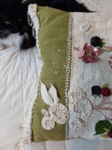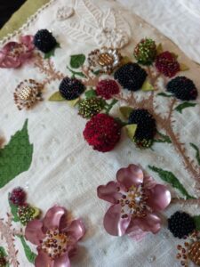 I sourced vintage recycled glass buttons from eBay, which were incorporated to create a different type of blackberry flower. These buttons, along with the sequined petals and Suffolk puffs, were sewn onto the base, with additional beadwork used to decorate the flower centers and outer edges. Lastly, I attached a period-styled crystal fringe to the ends of the cushion, adding a final touch of elegance.