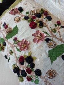 Hand embroidery was employed to add thorns along the blackberry stems, enhancing the motif with fine details. I also created appliqué leaves and Suffolk puffs, further adding texture. For the blackberry flowers, I used sustainable sequins from the Sustainable Sequin Company. Using a heat gun, I gently melted the sequins over a cockle shell to form delicate petal shapes, which resembled the flowers petals natural form.