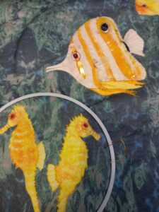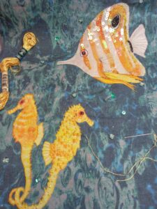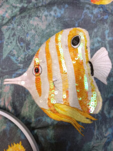The fish were painted as individual elements, and scanned in at high resolution to be cut out and arranged in photoshop. Lastly I printed the design onto natural linen and began to embellish using sustainable sequins, unwanted silk threads and unused glass beads. I have used various embroidery skills and stitches such as Satin and whip stitch, star stitch and French knots.