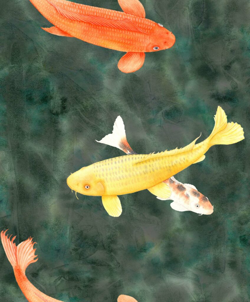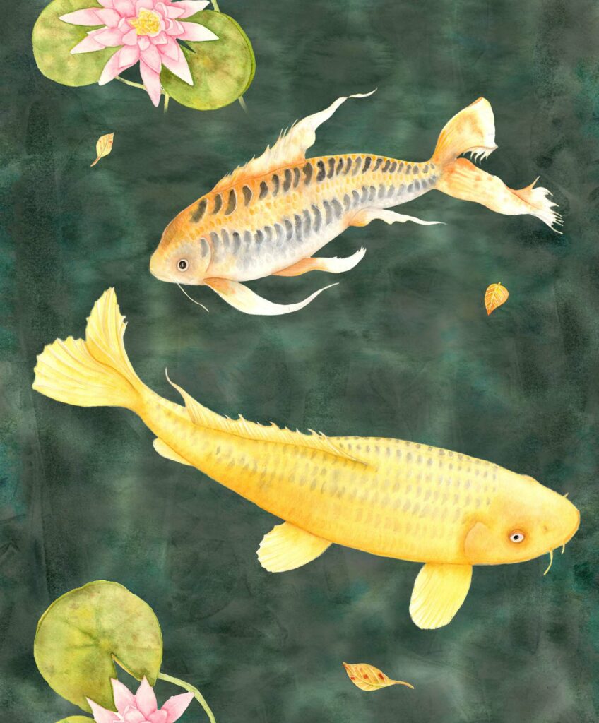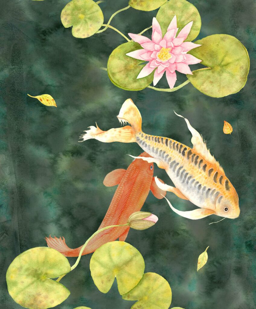 This piece was painted as individual elements, using watercolour paints, and were then used to design several interchangeable wallpaper drops in Photoshop. Each design is compatible with the others, and has an offset repeat. I wanted this piece to feel like you were standing in front of a real pond of koi.