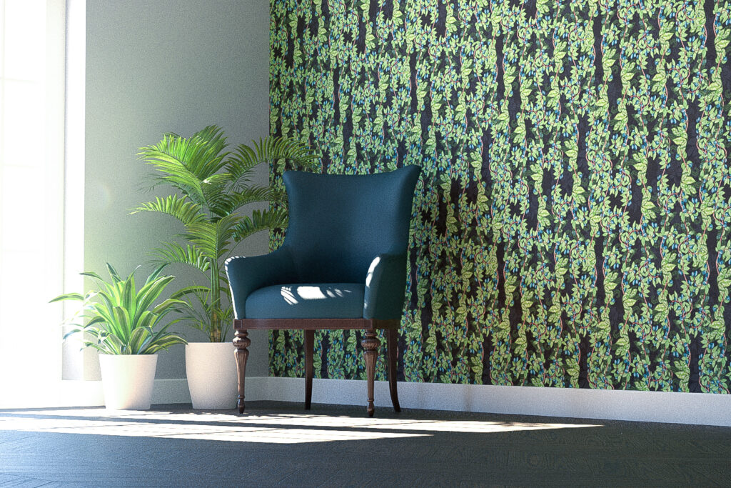 Over the years, I’ve built an extensive reference library composed of primary photographs I’ve taken and secondary images and research material I’ve collected. This particular artwork was inspired by a selection of these photographs. I had spotted a bush full of sloe berries, their branches heavy with fat, oval-shaped berries. The rich indigo-blue of the frosted berries, contrasted with the bright green, waxy leaves and pale coffee-colored branches, immediately caught my eye, and I knew they would make a beautiful subject for a design. The idea of capturing them in watercolor felt especially appealing.